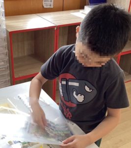 宿題が終わると、シールちぎり絵に挑戦! 集中